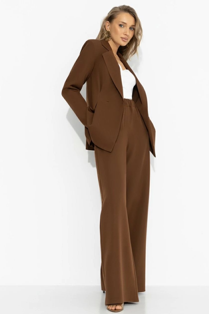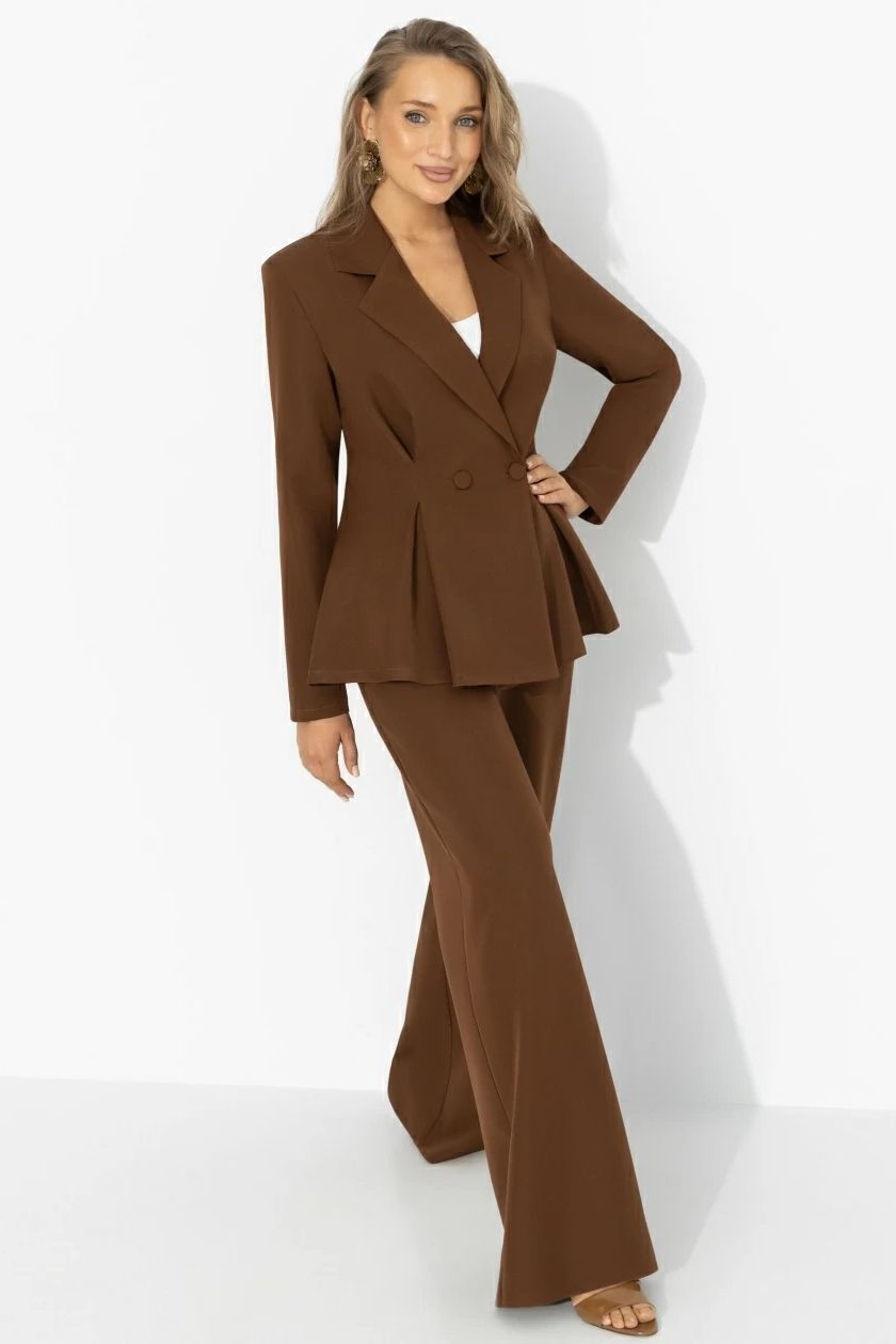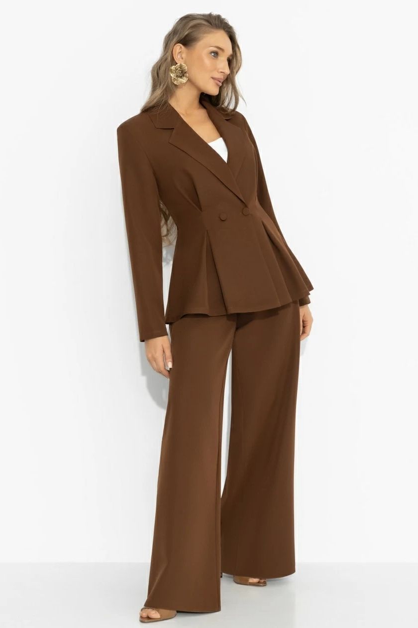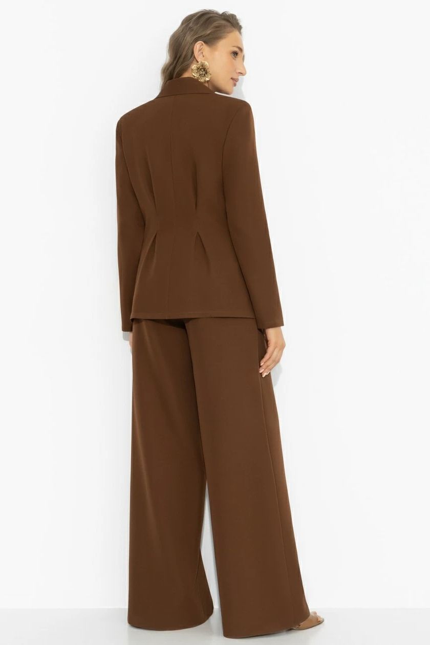 Костюм-двойка коричневый с брюками от компании Charutti, выполнен из костюмной ткани. Жакет с акцентом на талии формирует архитектуру образа, широкие брюки удлиняют линию ног и добавляют уверенного шага. Отличный выбор для Вашего безупречного образа.